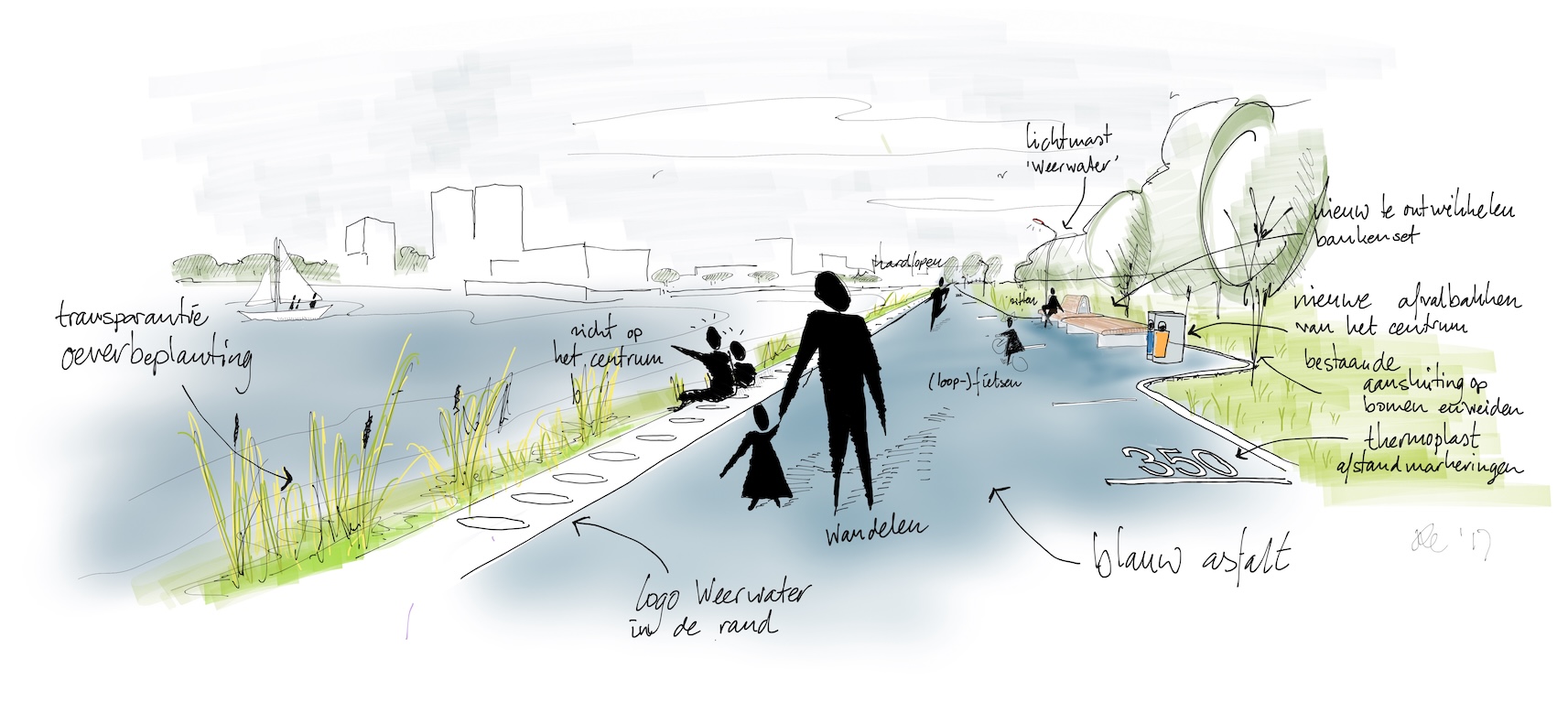 Het pad loopt rond het Weerwater en verbindt alle aanliggende wijken. Herkenbare materialisering van blauw asfalt, met witte afstands-signalering, luxe houten banken, verlichting en diverse symbolen, wijst de weg.